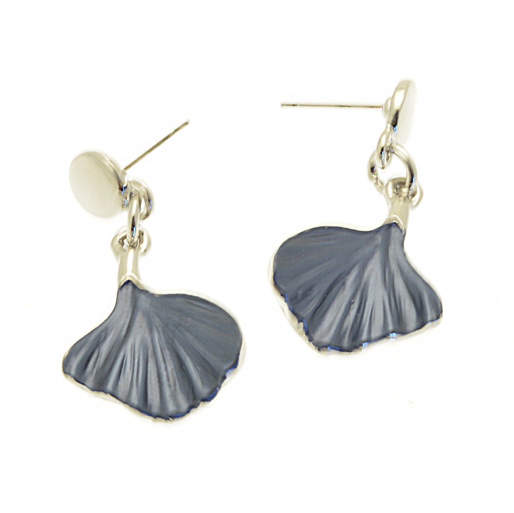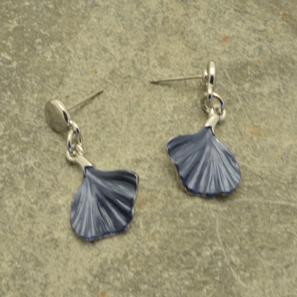The Ginkgo Biloba tree, known also as the maindenhair tree, has beautiful fan-shaped leaves, which are the inspiration for these pretty drop earrings. Hand-painted in a stylish midnight navy blue, the leaves measure 1.6cm wide and hang down 2cm from silver-coloured beads. The beads are secured in the ear with a post and silicon stopper.