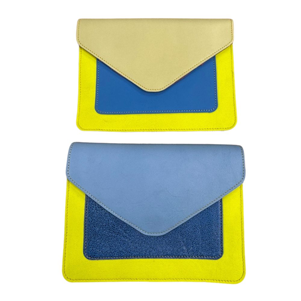 This striking, neon yellow-based Kiara recycled leather handbag has a large front flap with magnetic press stud closure. The rest of the bag is made up from pieces of plain coloured leather. The bag features a small front pocket and a roomy interior compartment with zipper pocket. A coordinating, detachable leather strap is packaged inside the bag.