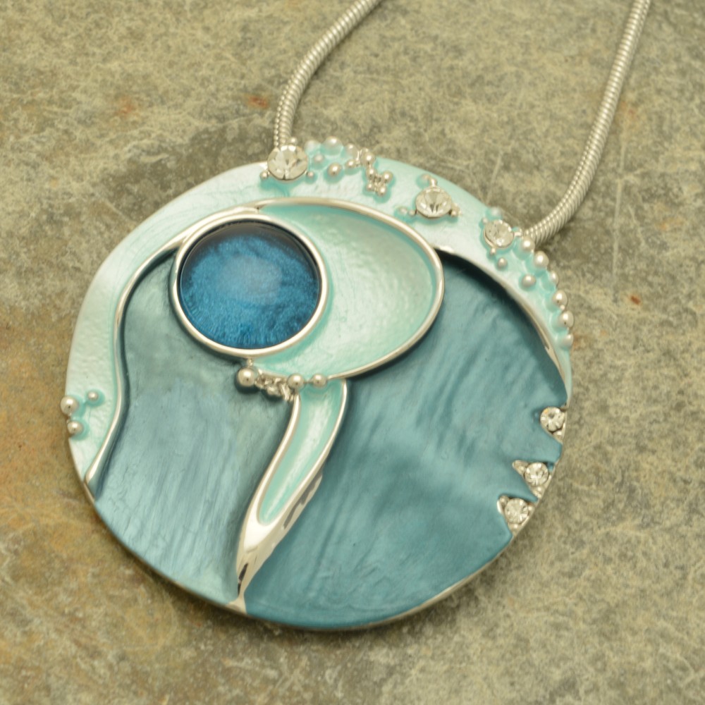 This pendant has such a unique, artistic feel; the round blue-green marbled resin centrepiece with flowing silver and pale aqua details almost looks like a wave wrapping around it. The pretty crystals and tiny silver beads twinkle like white horses catching the sun as they rise. The pendant is 3.6cm in diameter and hangs from a 41cm or 16″ snake chain that fastens with a lobster clasp and 8cm extender.