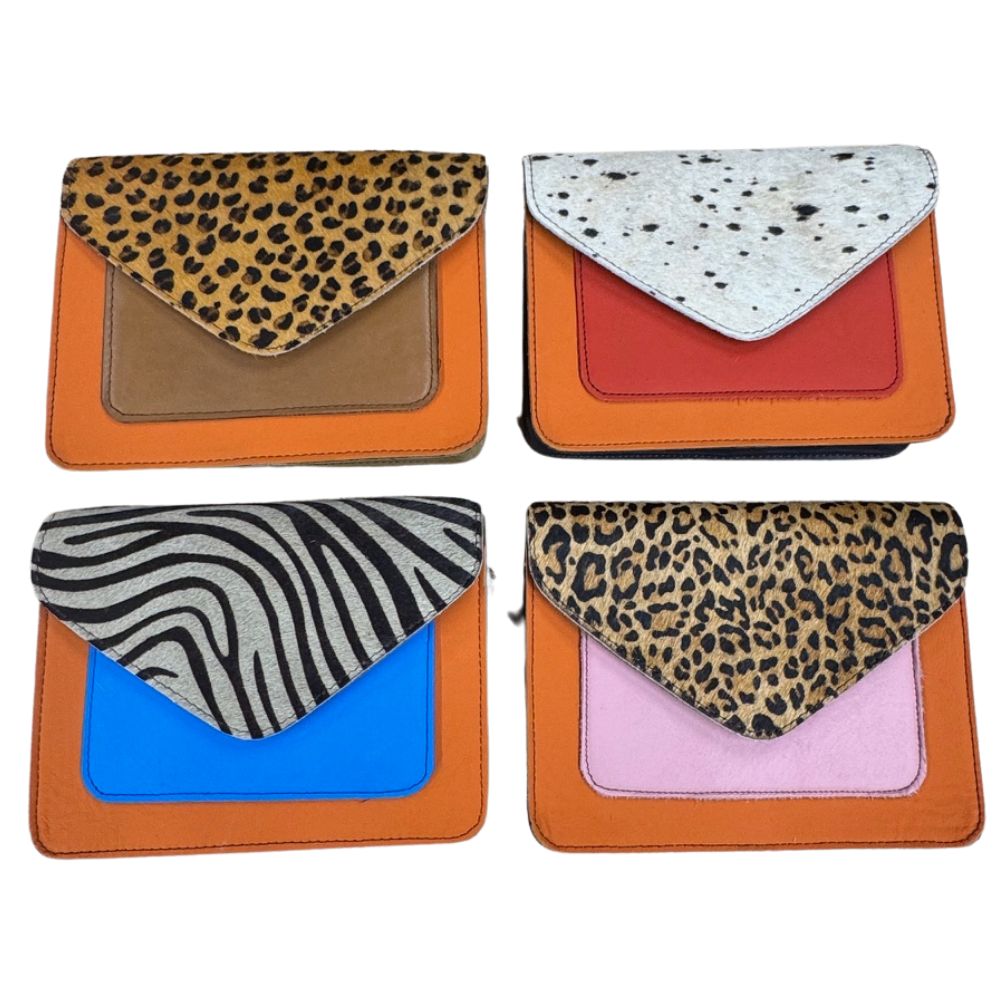This attractive, orange Kiara recycled leather handbag has an animal print flap with magnetic press stud closure. The rest of the bag is made up from plain coloured leather. The bag features a small front pocket and a roomy interior compartment with zipper pocket. A coordinating, detachable leather strap is packaged inside the bag.