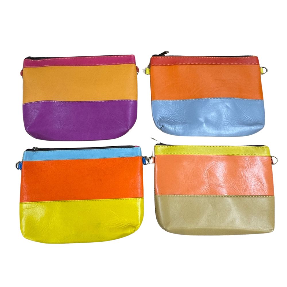 The contemporary, orange-based Lakshmi recycled leather handbag features a bold striped front with top zip closure. The back has a small top stripe and a fabric-lined zipped pocket. Inside the bag there is a single compartment with a reinforced open pocket and a zipped pocket. A coordinating, detachable leather strap is packaged inside the bag. It is adjustable in length so that you can carry the bag on your shoulder or wear it across your body.