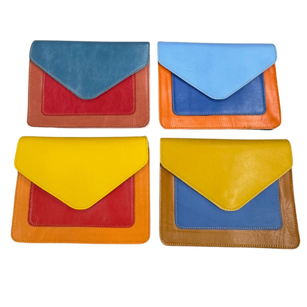 This attractive, orange or brown-based Kiara recycled leather handbag has a large front flap with magnetic press stud closure. The rest of the bag is made up from pieces of plain coloured leather. The bag features a small front pocket and a roomy interior compartment with zipper pocket. A coordinating, detachable leather strap is packaged inside the bag.