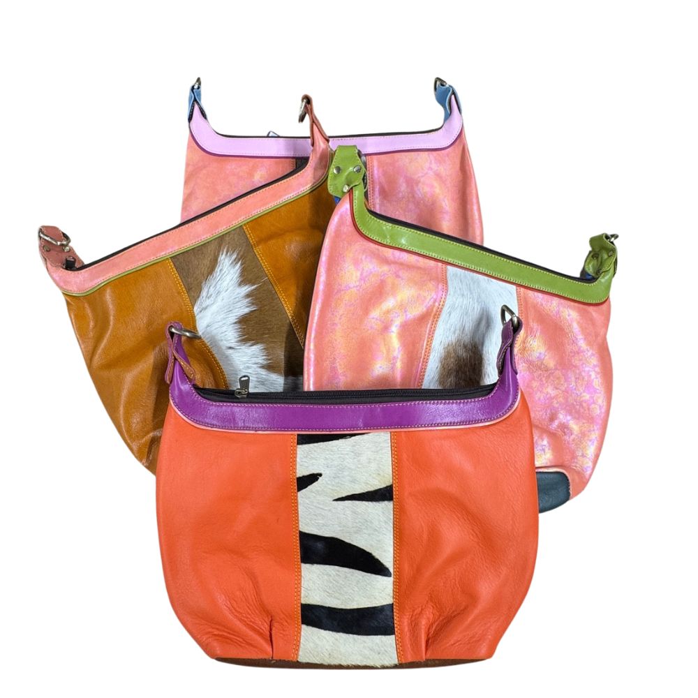 Our striking, orange Shivani recycled leather handbag features a bold striped front with animal print section and top zip closure. There is a convenient zipped pocket on the back. Inside the bag there is a single, fabric-lined compartment with a reinforced open pocket that will fit most phones plus a zipped pocket. A coordinating, detachable leather strap is packaged inside this great size, every day bag. The strap is adjustable in length so that you can carry the bag on your shoulder or wear it across your body.