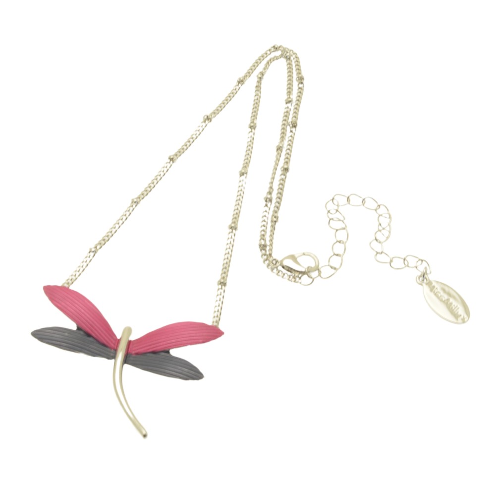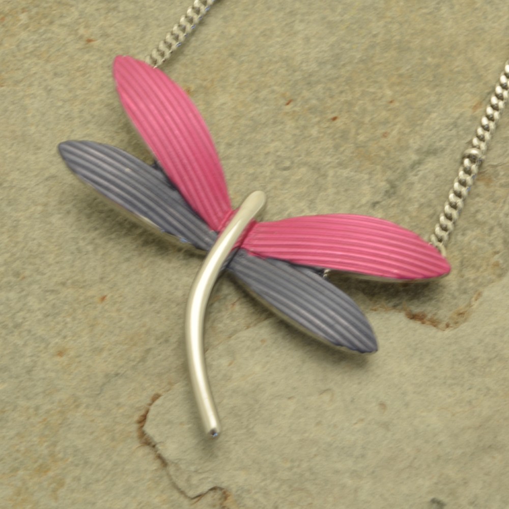 This pretty pink and purple dragonfly necklace adds a bold touch of colour. The dragonfly is 3cm from the tip of its wings to the bottom of its tail, and 4.3cm across. It hangs from a 16″ or 41cm knotted style chain that fastens with a lobster clasp and 8cm extender.