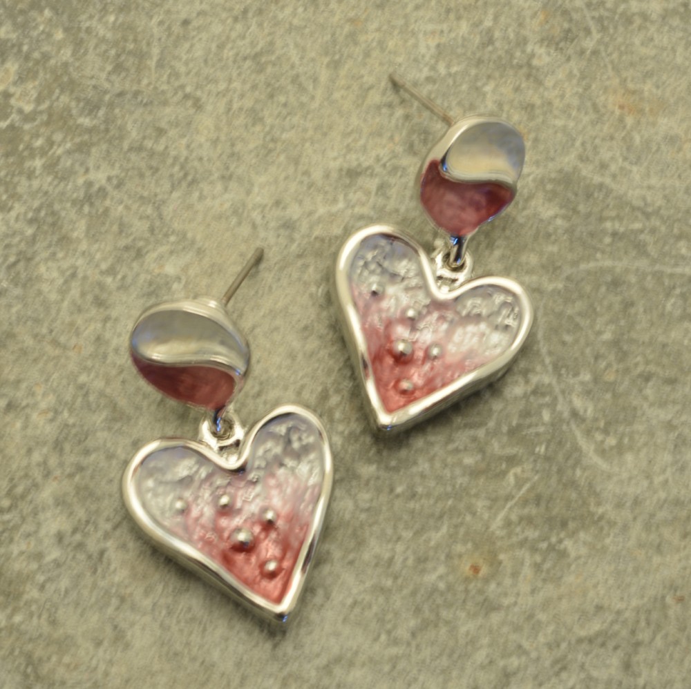 Handpainted in a pretty blend of blush pink, baby pink and silver-grey, these pretty earrings feature a heart with raised, silver-coloured edging and embedded tiny silver-coloured metal balls, topped with a ying yang style bead. The earring drops 3cm and is 1.8cm wide. It is secured in the ear with a post and silicon stopper.