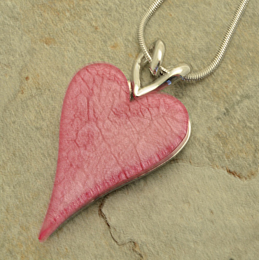 In a pretty, mid pink marbled resin, this lovely heart pendant has a second silver heart to hang from. The full pendant measures approx 2.8cm wide by 5.5cm high. The necklace measures 41cm or 16″ long and fastens with a lobster clasp and 8cm extension chain.