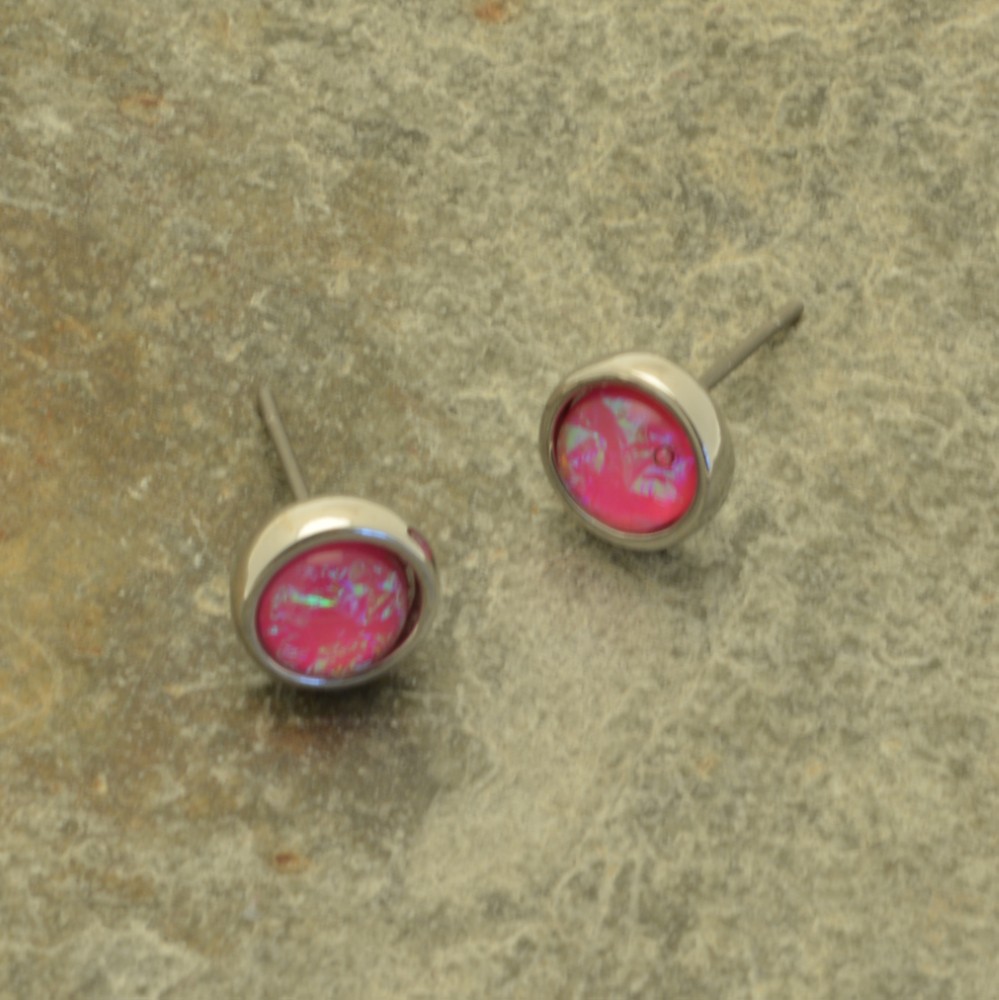 These eye-catching pink stud earrings are made with an iridescent or opalescent resin, which gives them a lovely shimmer. They are classically simple and timeless with an attractive shiny silver surround.