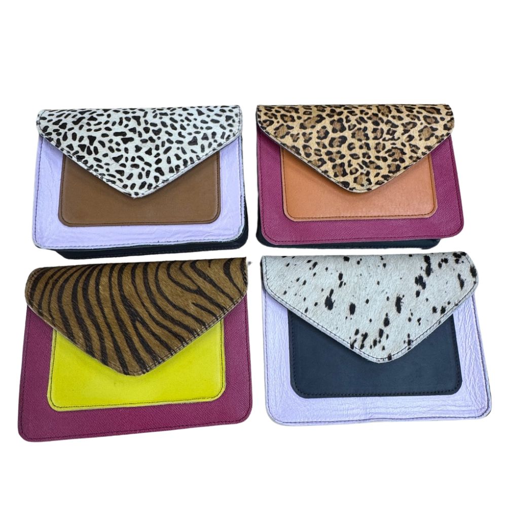 This attractive, pink Kiara recycled leather handbag has an animal print flap with magnetic press stud closure. The rest of the bag is made up from plain coloured leather. The bag features a small front pocket and a roomy interior compartment with zipper pocket. A coordinating, detachable leather strap is packaged inside the bag.