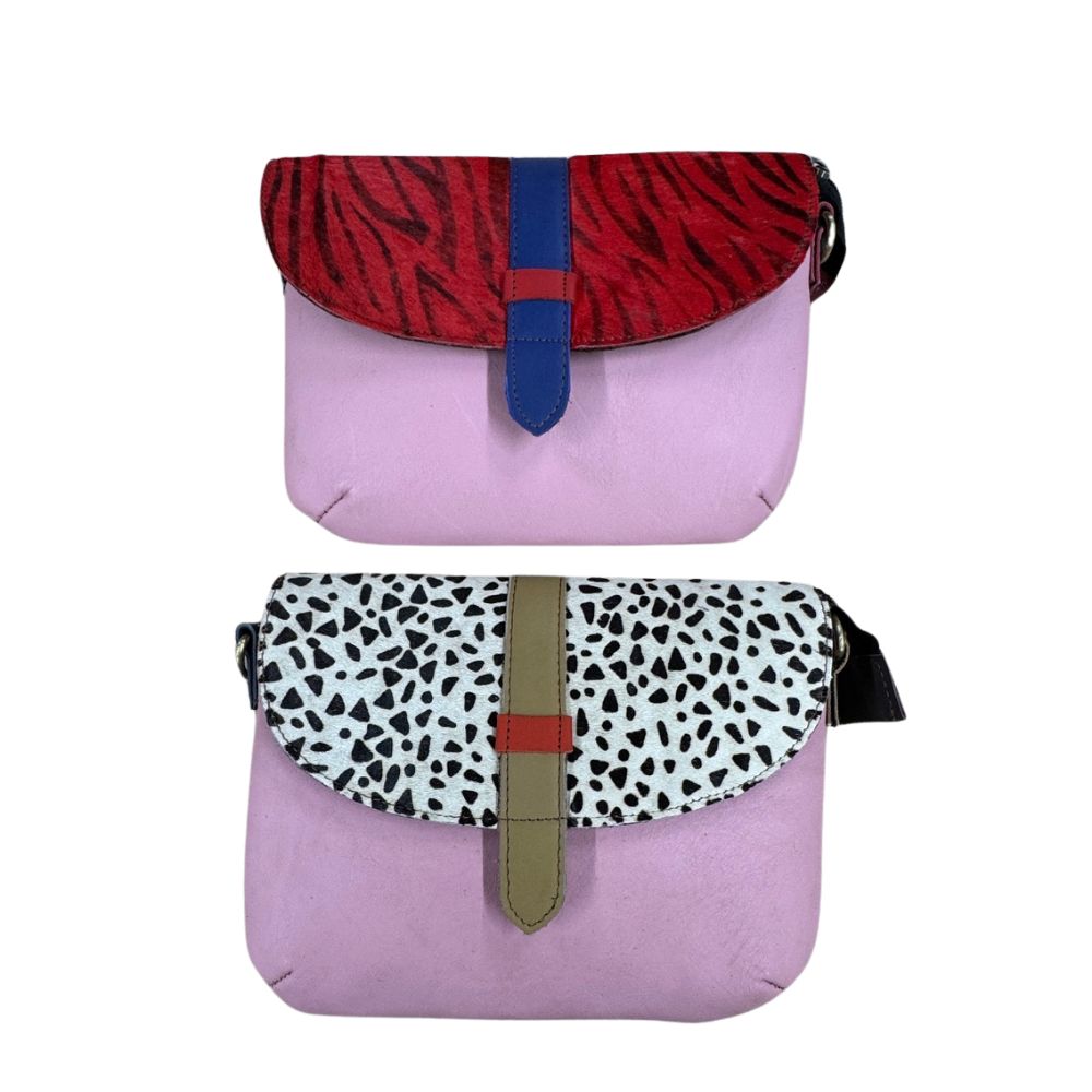Our gorgeous, pink Laila recycled leather clutch bag features an animal print flap with a false strap and magnetic press stud closure. The rest of the bag is made up from plain coloured leather. The bag features a zipper pocket on the rear for safe storage with easy access, and the interior has a second zipper pocket. A coordinating, detachable leather strap is packaged inside the bag for versatility so that you can also use it as a shoulder bag.