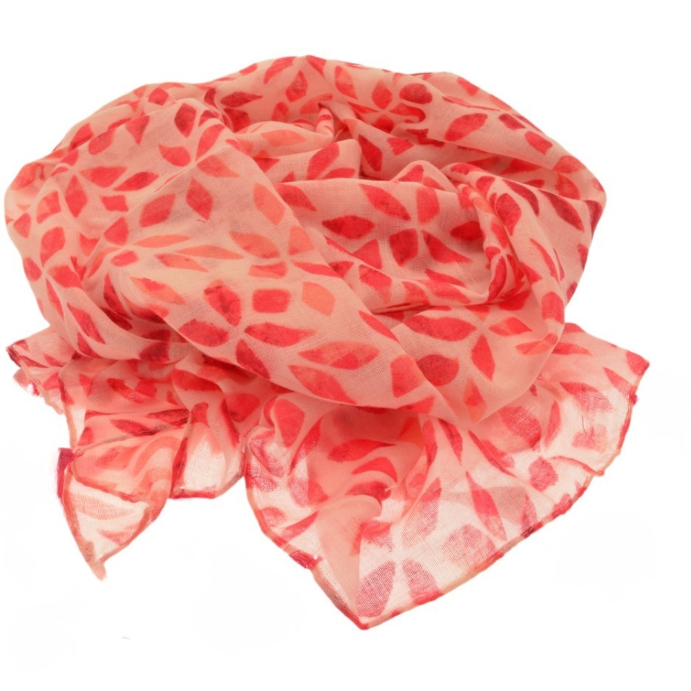 Featuring a classic leaf design, this soft, scarf is in a vibrant reddish pink. It is made with a soft 20% cotton and 80% viscose mix. It measures 180cm by 90cm and weighs 100g. It can be washed at 30 degrees Celsius but handwashing is preferable.?