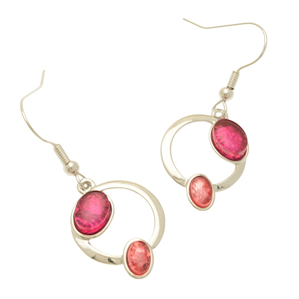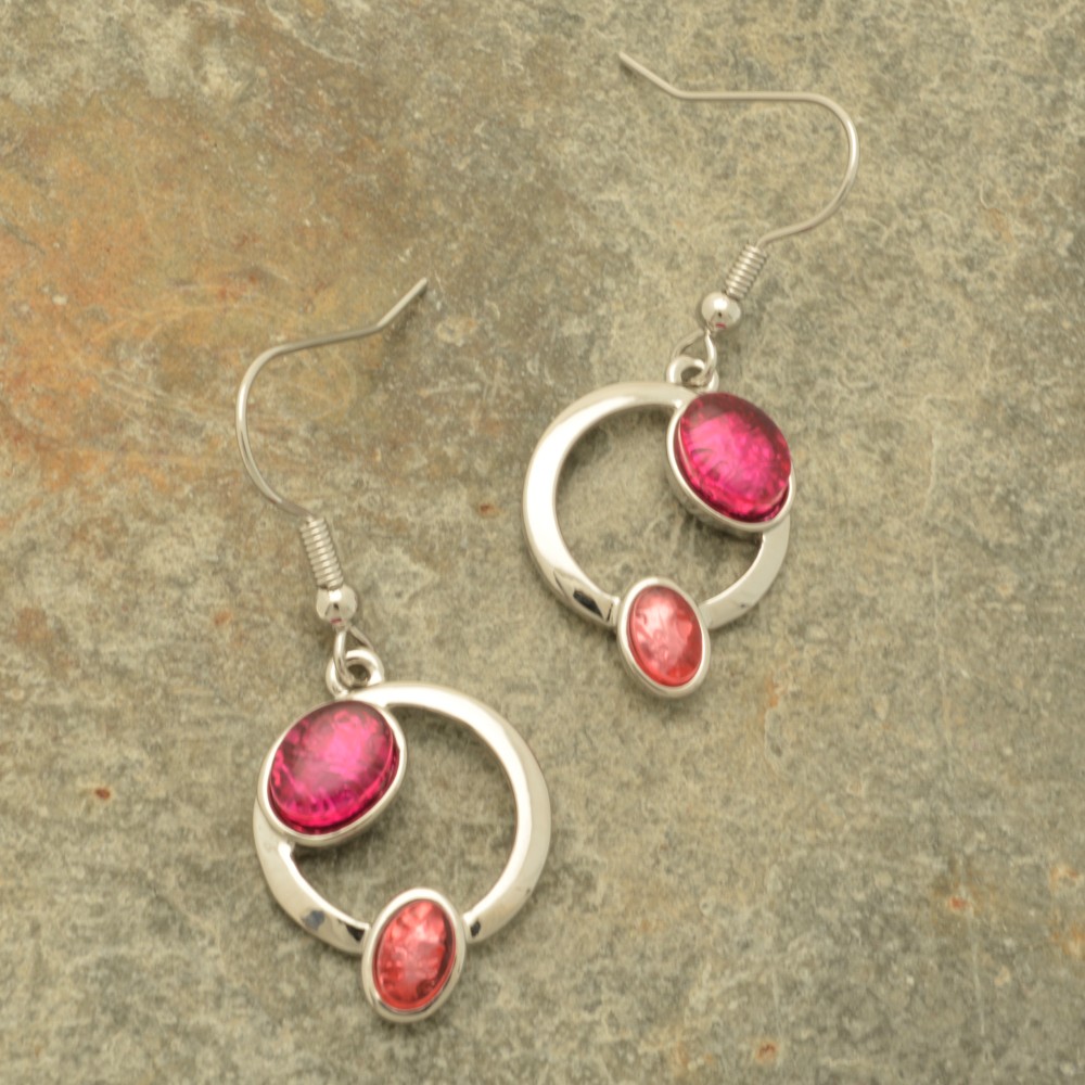 These minimalist drop earrings feature a shiny silver-coloured hoop adorned with two resin lozenges in fuchsia pink and warm coral. The resin is backed with aluminium foil, giving it lustre and depth. The earrings measure 2cm high by 1.5cm wide and hang from fishhooks.