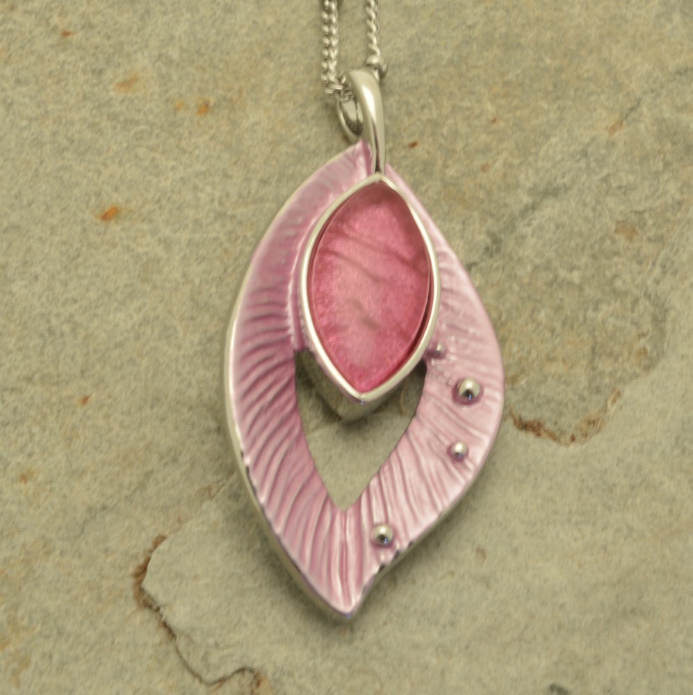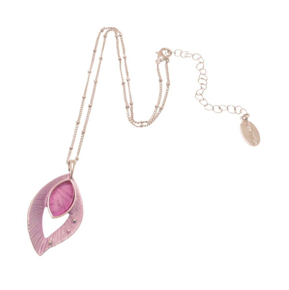 The pretty pink marbled resin, teardrop bead sits within a hand-painted textured surround, embellished with three, tiny silver-coloured balls. The pretty pendant is 4.3cm high by 2cm wide and hangs on a knotted-style chain of 16″ or 41cm. The necklace fastens with a lobster clasp and 8cm extension chain.