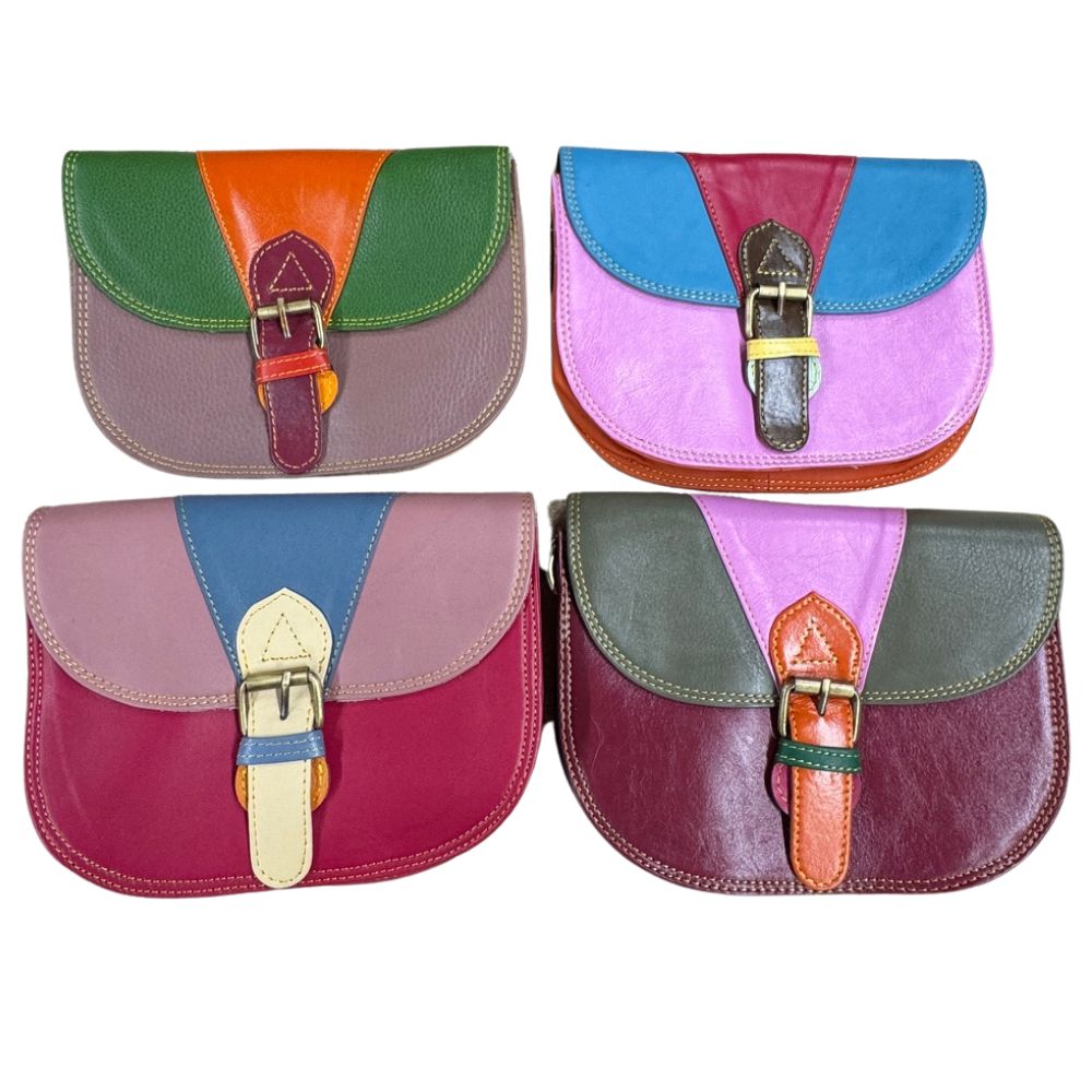 The compact, pink Shreya recycled leather handbag has a tricolour front flap with false buckle and magnetic press stud closure. Perfect for carrying your phone, keys and cards or cash, the rest of the bag is made up from different, plain coloured leathers. Inside the bag is a fabric-lined compartment with zipper pocket. A coordinating, detachable leather strap is packaged inside the bag. It is adjustable in length so that you can carry the bag on your shoulder or wear it across your body.