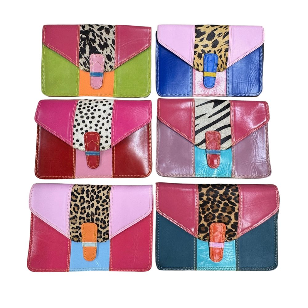 Every Tanvi handbag is unique, being handcrafted in India from offcuts discarded by the leather trade so no two handbags will feature the same colour combination. Please note that colours and textures may vary due to the nature of recycled leather. The handbag measures approximately 27 x 19 x 5.5cm and the shoulder strap is 1.9cm wide and adjustable in length.