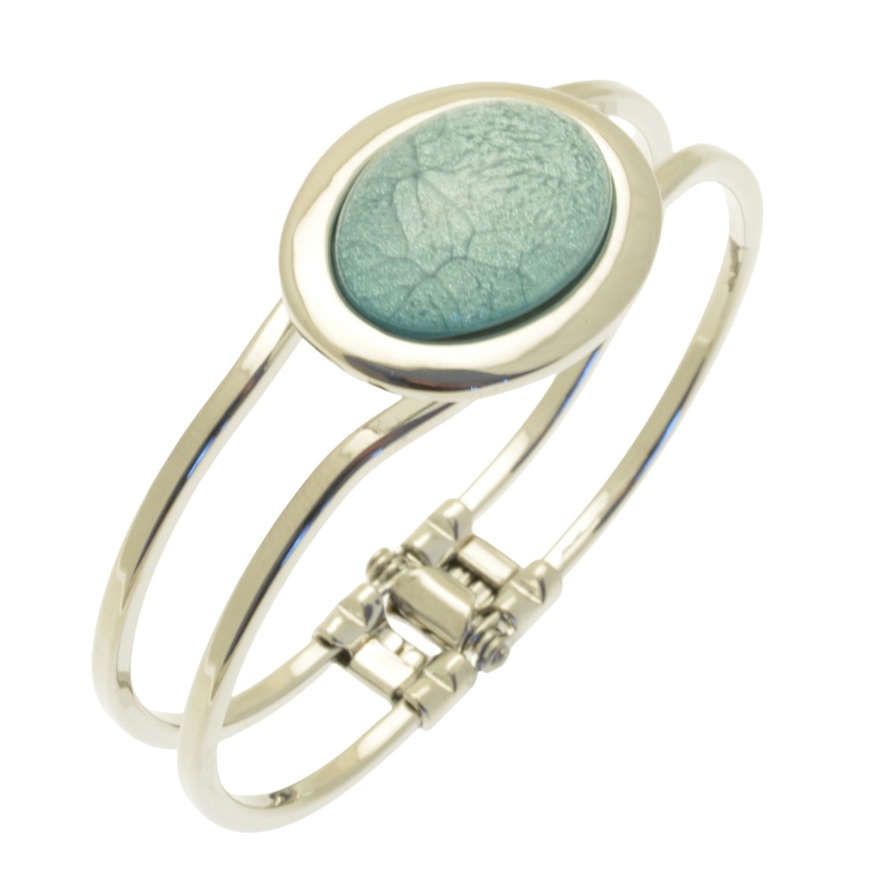 This powder blue bangle is our most popular style of bracelet and uses a resin backed with marbled paper, which gives it an illusion of depth and texture. It has a hinged clasp making it a universal fit. The oval decoration measures approx 3cm by 2.5cm.