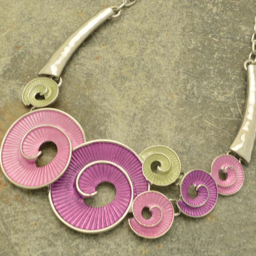 Created with an unusual colour combination of dark purple, pinky purple and lime green, this handpainted, textured necklace features swirls of colour in varying sizes. It also has two arms of hammered shiny, silver-coloured metal to frame the design. The largest swirl is approximately 3cm in diameter. The necklace is 41cm or 16″ in length and fastens with a lobster clasp and 5cm extension chain.