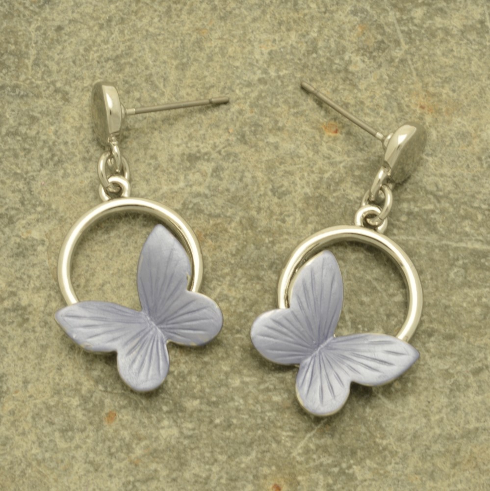 A pretty, fluttering lavender purple butterfly perches on a silver hoop in this delightful Spring and Summer jewellery. The earrings are 1.6cm wide and drop down 2.3cm from a silver-coloured bead. The earrings are held in the ear with a post and silicon stopper.