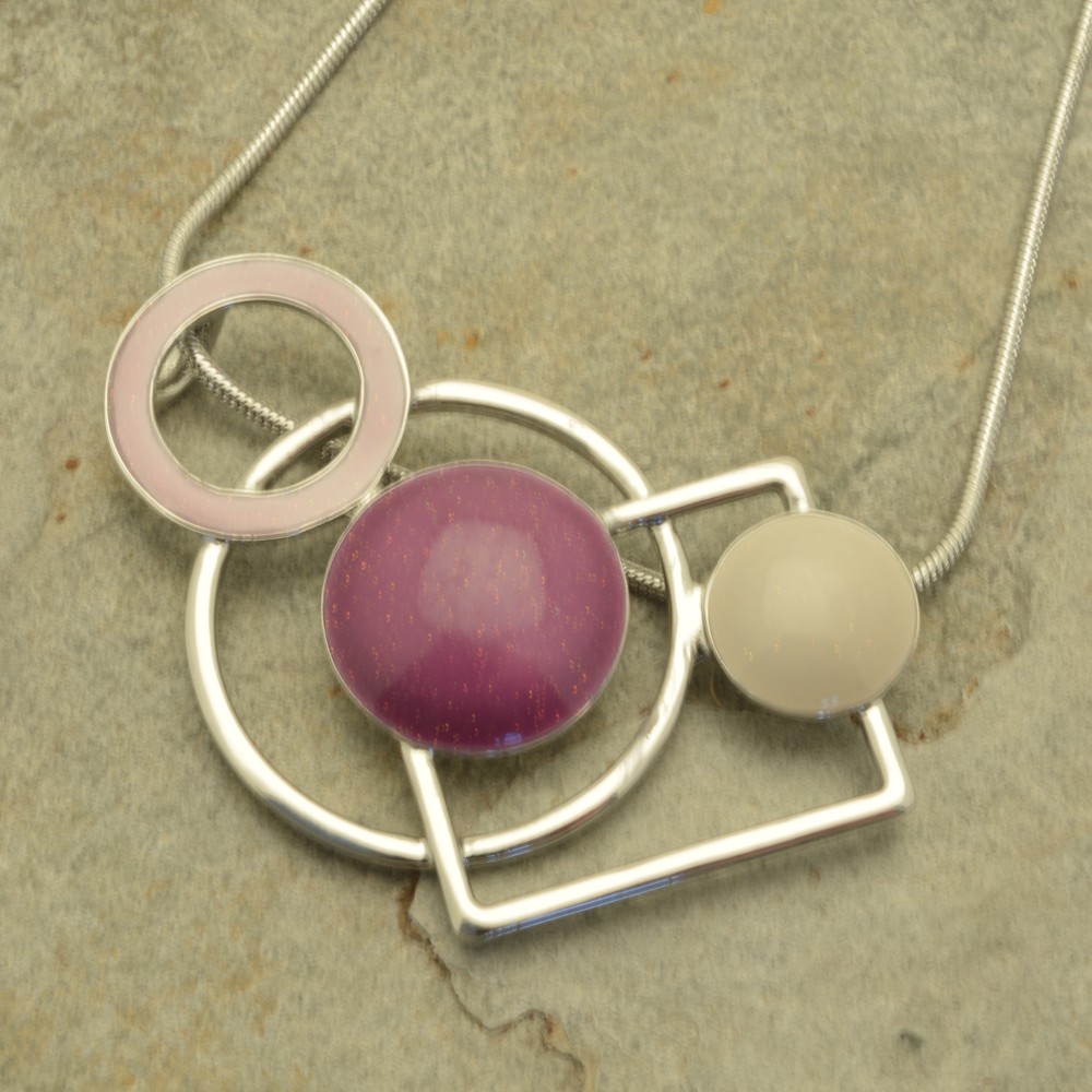 Three hoops and discs in purple, pink and cream with a sparkled, gloss finish sit atop silver-coloured circular and rectangular frames. The decorative element is 3.5cm high by 5.7cm wide and hangs from a snake chain of 16″ or 41cm. The chain fastens with a lobster clasp and 8cm extender.