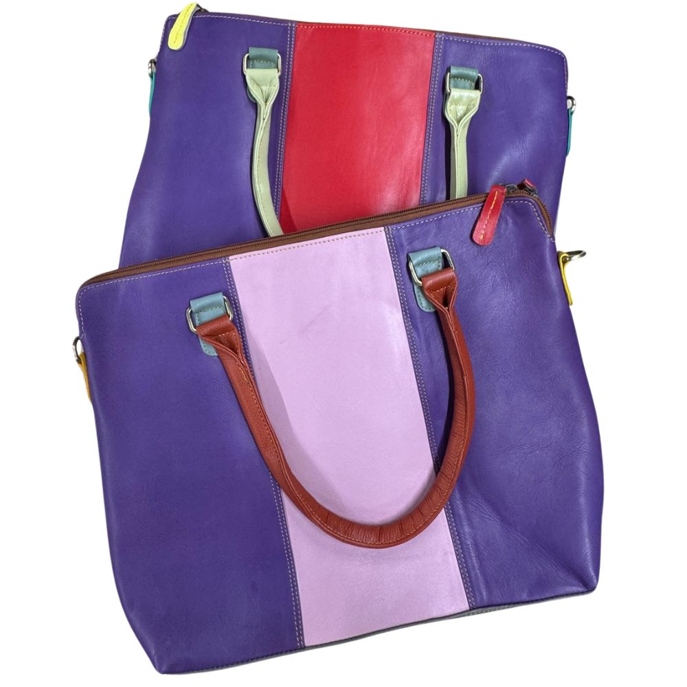 Perfect for carrying most laptops and tablets, our purple Jiya recycled leather handbag features a bold striped front with top zip closure. There is a convenient zipped pocket on the back. And this bag has fixed handles for carrying by hand as well as a detachable shoulder strap. The Jiya also features five metal studs on the solid base for protection if placed on the floor. Inside the fabric-lined bag there is a padded divider with Velcro tab to protet your electronics and a zipped pocket.