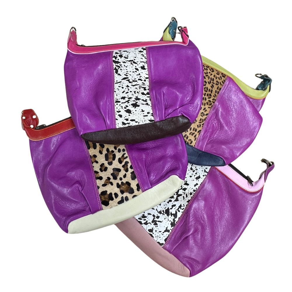 Our striking, purple Shivani recycled leather handbag features a bold striped front with animal print section and top zip closure. There is a convenient zipped pocket on the back. Inside the bag there is a single, fabric-lined compartment with a reinforced open pocket that will fit most phones plus a zipped pocket. A coordinating, detachable leather strap is packaged inside this great size, every day bag. The strap is adjustable in length so that you can carry the bag on your shoulder or wear it across your body.