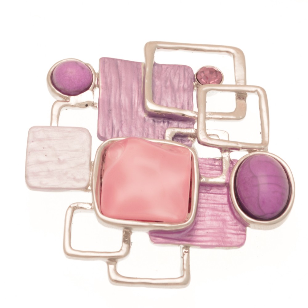 A striking combination of materials and finishes with a geometric style, this brooch uses a mix of purples and pink. The brooch measures 5.3cm high by 5cm wide and is held in place with a strong magnet. It can easily be moved between clothing, hats, scarves and bags without making holes, and can be used to decorate anything made of metal.