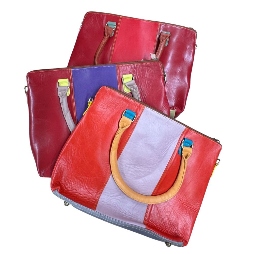 Every Jiya handbag is unique, being handcrafted in India from offcuts discarded by the leather trade so no two handbags will feature the same colour combination. Please note that colours and textures may vary due to the nature of recycled leather. The handbag measures approximately 40 x 31.5 x 11cm and the shoulder strap is 1.9cm wide and adjustable in length.