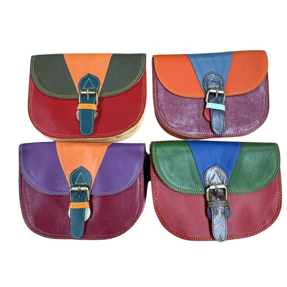 The compact, red Shreya recycled leather handbag has a tricolour front flap with false buckle and magnetic press stud closure. Perfect for carrying your phone, keys and cards or cash, the rest of the bag is made up from different, plain coloured leathers. Inside the bag is a fabric-lined compartment with zipper pocket. A coordinating, detachable leather strap is packaged inside the bag. It is adjustable in length so that you can carry the bag on your shoulder or wear it across your body.
