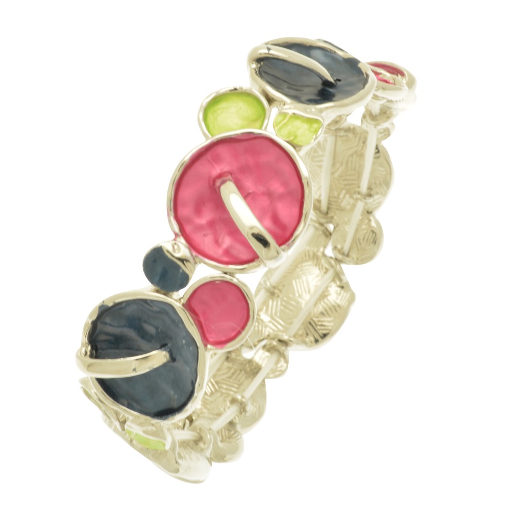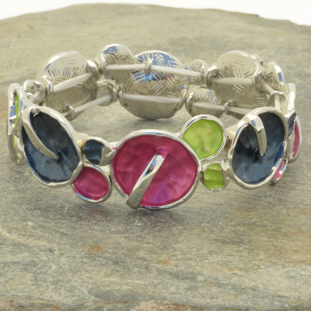Such a celebration of colour. The contrast of the dark blue, fuchsia pink and acid lime is sublime and such an eye-catcher. And the edging and addition of silver-coloured embellishments gives it a classy finish. If these really were lily pads, what a display it would be! The largest lily pad is approximately 1.8cm in diameter and the bracelet is elasticated to suit varying sizes of wrist.