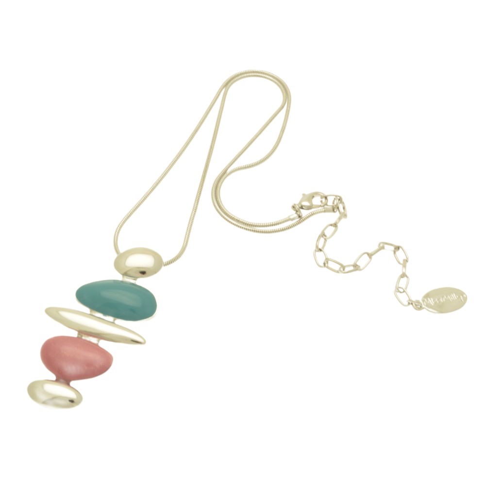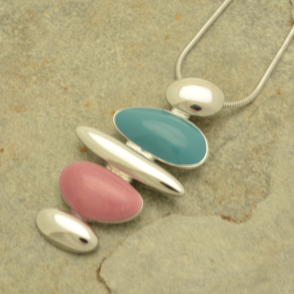 This is a colourful, jewellery representation of a cairn; a man-made stack of rocks placed atop each other to mark a path or special place. The glossy teal and glittery, dusky pink pieces break up the shiny silver-coloured stones. The pendant is 5cm high by 3cm wide and hangs from a snake chain of 41cm or 16″. The necklace fastens with a lobster clasp and 8cm extension chain.