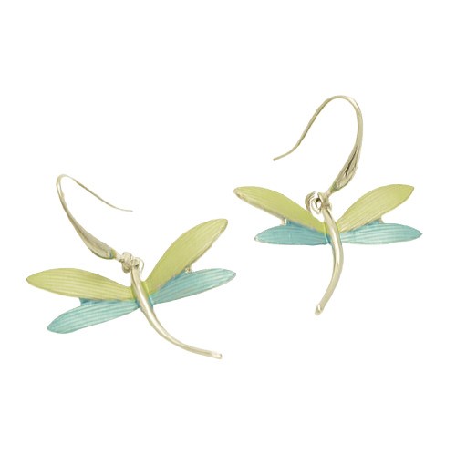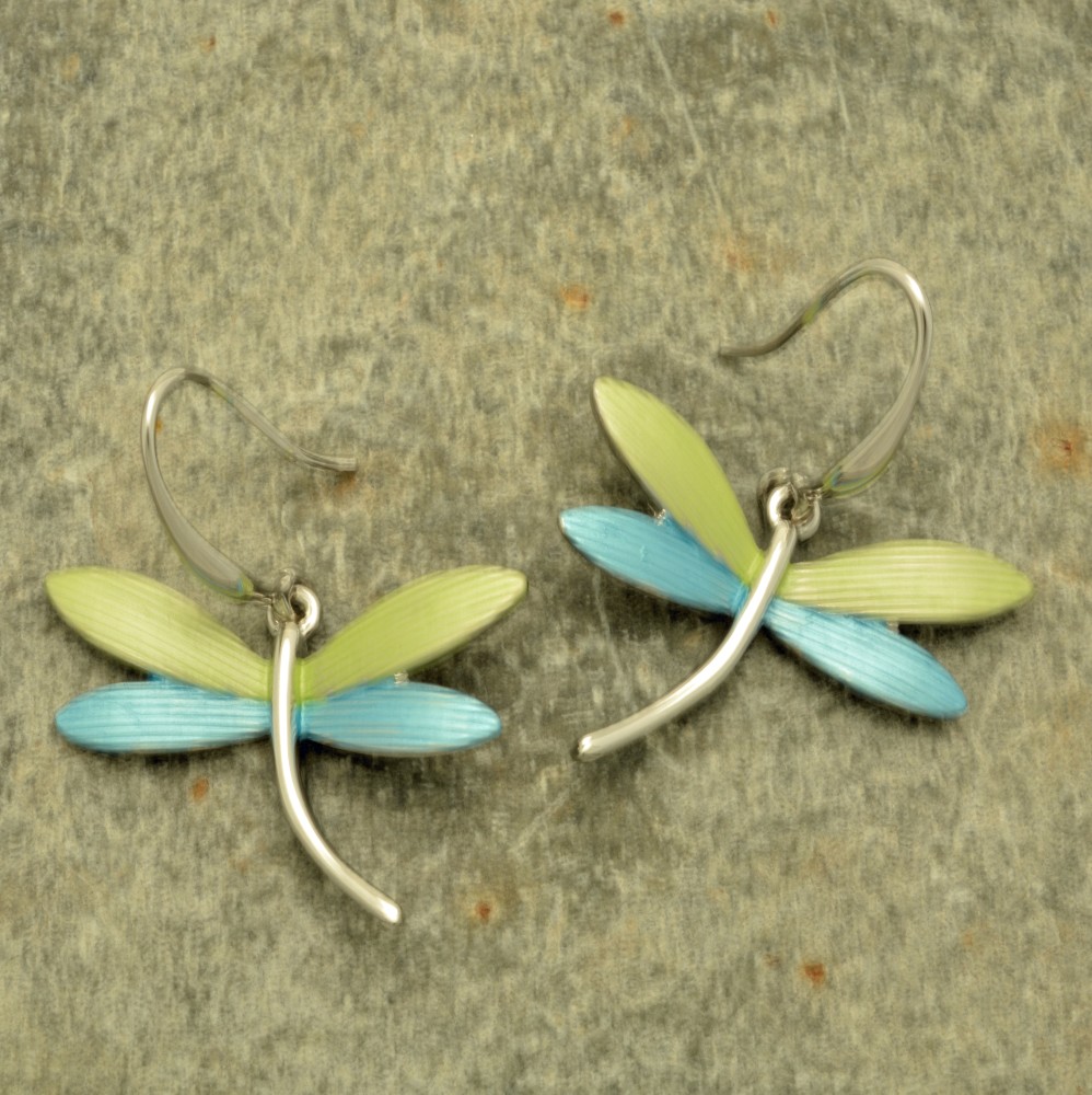 These pretty turquoise and lime green dragonfly earrings add a sunny touch of colour. The dragonfly is 2cm from the tip of its wings to the bottom of its tail, and 2.8cm across. The earrings hang from curved French Hooks.