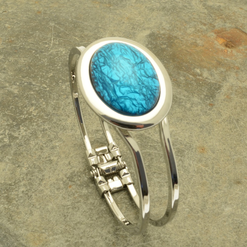 This bright turquoise bangle is our most popular style of bracelet and uses a resin backed with aluminium foil, which gives it an illusion of depth and texture. It has a hinged clasp making it a universal fit. The oval decoration measures approx 3cm by 2.