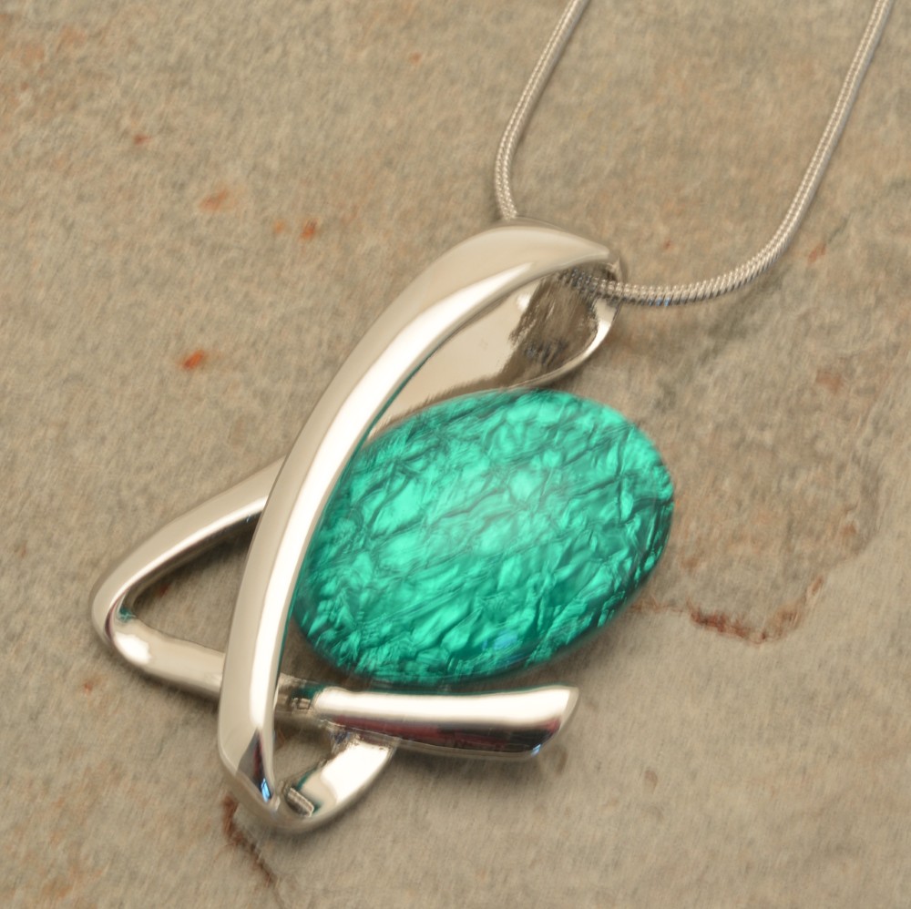An eye-catching oval bead of turquoise green resin sits within a silver-coloured metal squiggle, which is almost a reverse ampersand. The resin is backed with aluminium foil, giving it lustre and depth. The pendant measures 4.2cm high by 3cm wide and hangs from a snake chain of 41cm with 8cm extender.