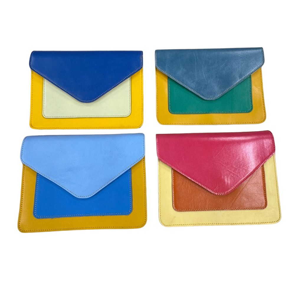 This attractive, yellow-based Kiara recycled leather handbag has a large front flap with magnetic press stud closure. The rest of the bag is made up from pieces of plain coloured leather. The bag features a small front pocket and a roomy interior compartment with zipper pocket. A coordinating, detachable leather strap is packaged inside the bag.