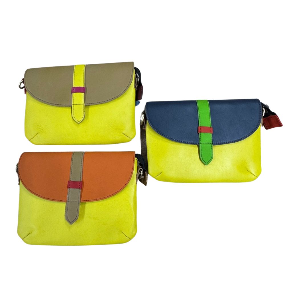 Our gorgeous, yellow Laila recycled leather clutch bag features a block colour flap with a false buckle strap and magnetic press stud closure. The rest of the bag is made up from a different plain coloured leather. The bag features a zipper pocket on the rear for safe storage with easy access, and the interior has a second zipper pocket. A coordinating, detachable leather strap is packaged inside the bag for versatility so that you can also use it as a shoulder bag.