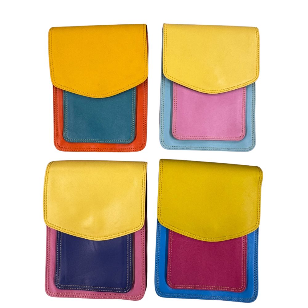 The Yellow Maya Bag is really useful for trips out when you only need your phone, keys and bank card or a bit of change. This design features an animal print front flap with magnetic press stud closure. The rest of the genuine recycled leather used on the bag is in block colours. Under the flap you’ll find a small front pocket and a zippered pocket. Inside the main compartment are two sections.