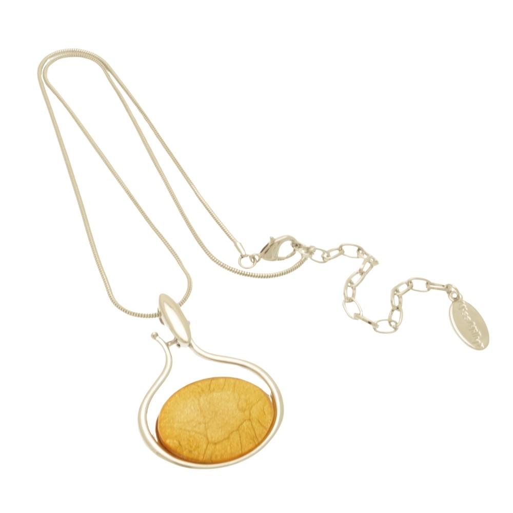 Featuring an elegant oval resin bead in sunshine yellow, this piece is set with a graceful, silver-coloured frame that enhances the design. The pendant measure approximately 4.2cm high by 3.2cm wide and hangs from a knotted style chain. The chain is 41cm or 16″ long and fastens with a lobster clasp and 8cm extender.